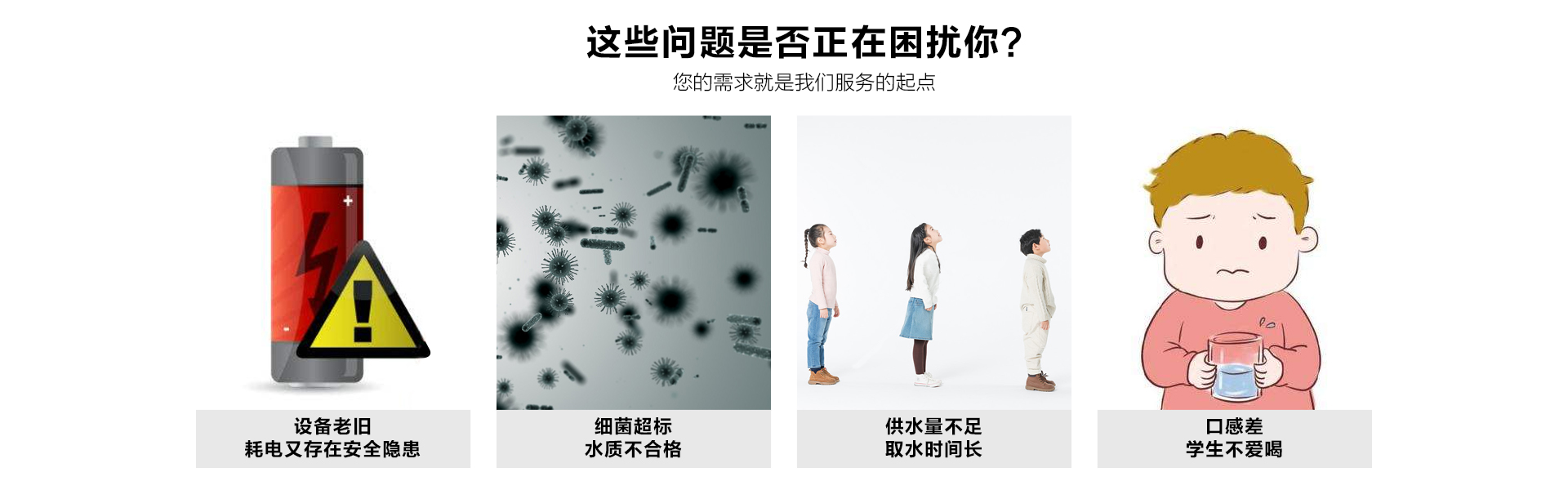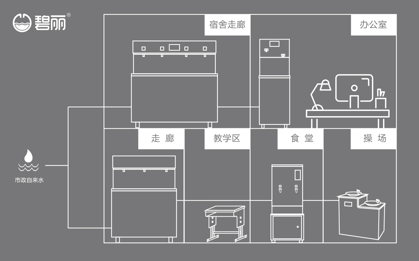 不同的飲水點(diǎn)可根據(jù)實(shí)際使用情況,安裝管線機(jī)或飲水設(shè)備或開水器,使用戶能喝上開水、溫開水、純凈水等,來滿足不同場景的飲水需求;