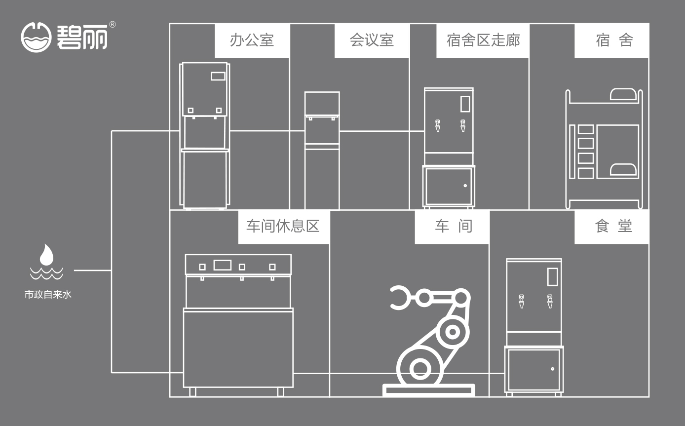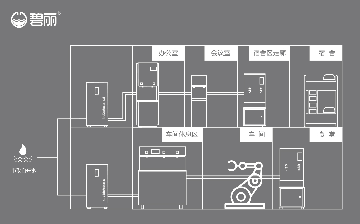 • 碧麗商用反滲透純水機將自來水集中處理后,把優(yōu)質(zhì)的純凈水通過專用的供水管道輸送到各飲水點;